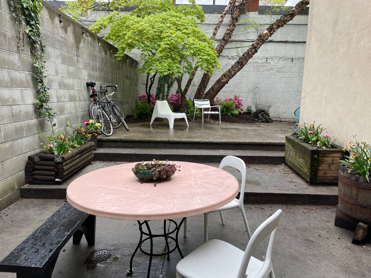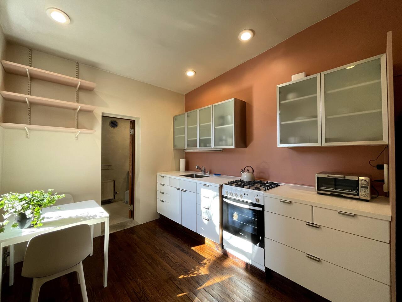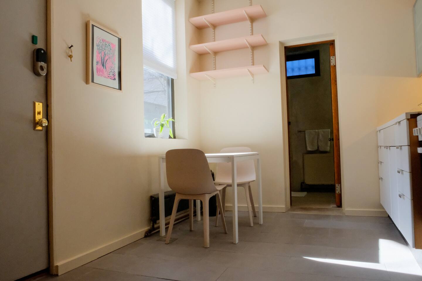 This secluded gem has high ceilings and tall windows, letting in great light and a lovely view of the garden. In the bedroom you'll find a queen bed with new mattress and bed frame, 100% cotton sheets, four comfortable pillows. Amazing wall-to-wall closet with tons of storage options, room to hang short and long garments, drawers, shoe storage, and suitcase storage above. Iron and ironing board provided. The living room is cozy and outfitted with a new seven-foot sofa, which can open up to a full-size bed. The kitchen is fully stocked with everything needed to cook, and a 2 top kitchen table, which can be used for WFH. You'll find tons of kitchen storage as well as an additional utility cupboard. The bathroom has plaster walls and unique, crafty river stone tilework in the shower. Green marble sink, kohler basin and two separate medicine cabinet sections with great storage capacity. You'll find Japanese Maple, Paper Birch and Empress trees in the outdoor space, which bloom beautifully in warmer months. The patio area directly next to your entrance is dedicated to the apartment and has a table and chairs for outdoor relaxation. BBQ in warmer months! As this is a longer term rental, we have a cleaner that can come weekly/bimonthly to do cleanings, change sheets and towels for an extra charge.